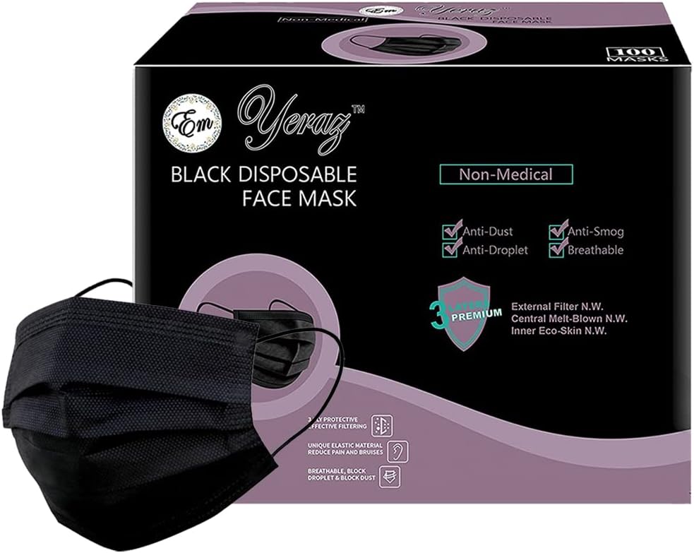 3-Layers of Disposable face mask: non-woven outer filter layer, a premium melt-blown polypropylene filtration layer, and non-woven inner filter layer. Soft elastic ear loops and flexible adjustable nose clip black face mask