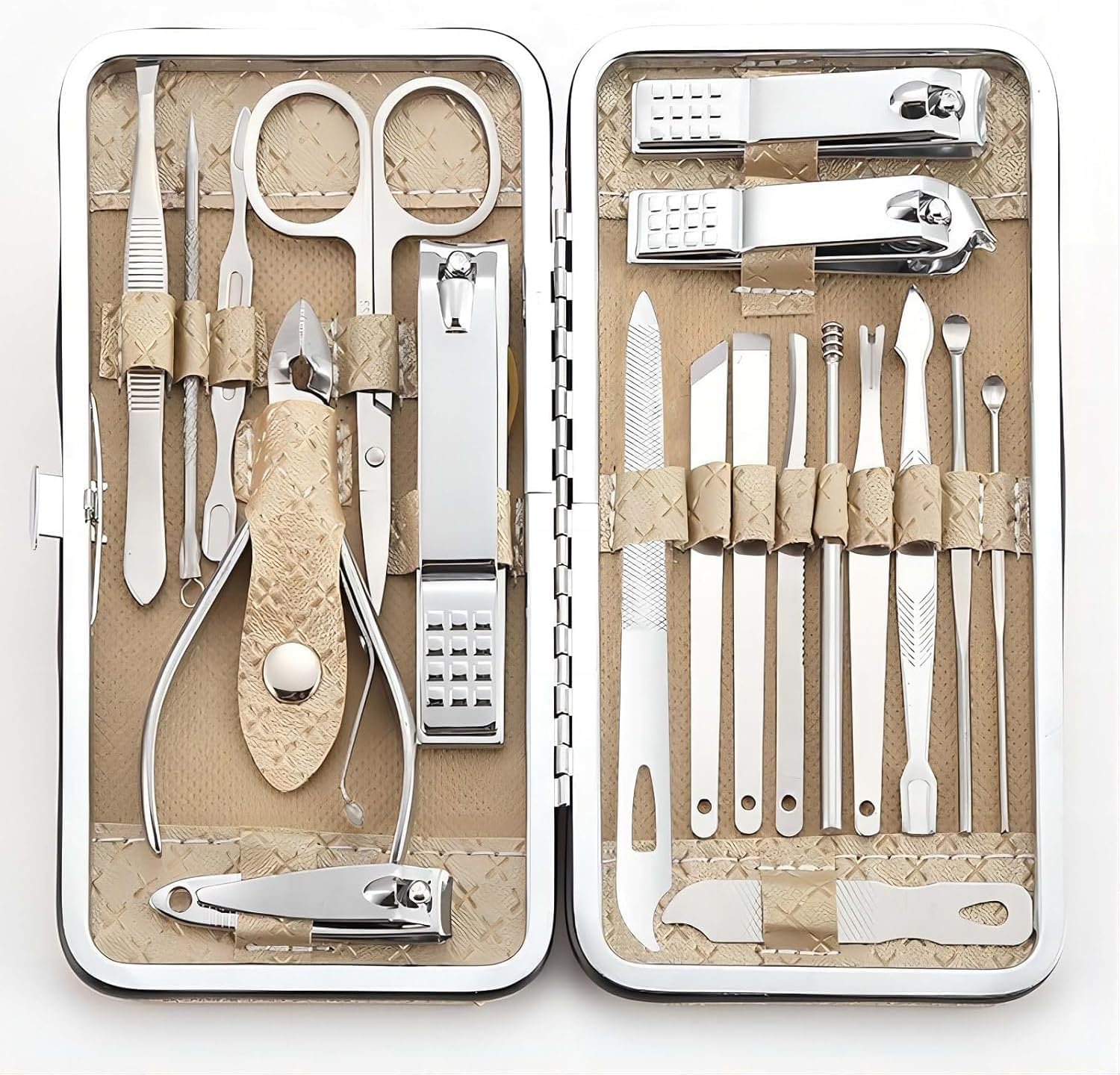 COMPLETE SET: 19-piece professional manicure and pedicure kit includes nail clippers, scissors, and grooming tools in a compact travel case