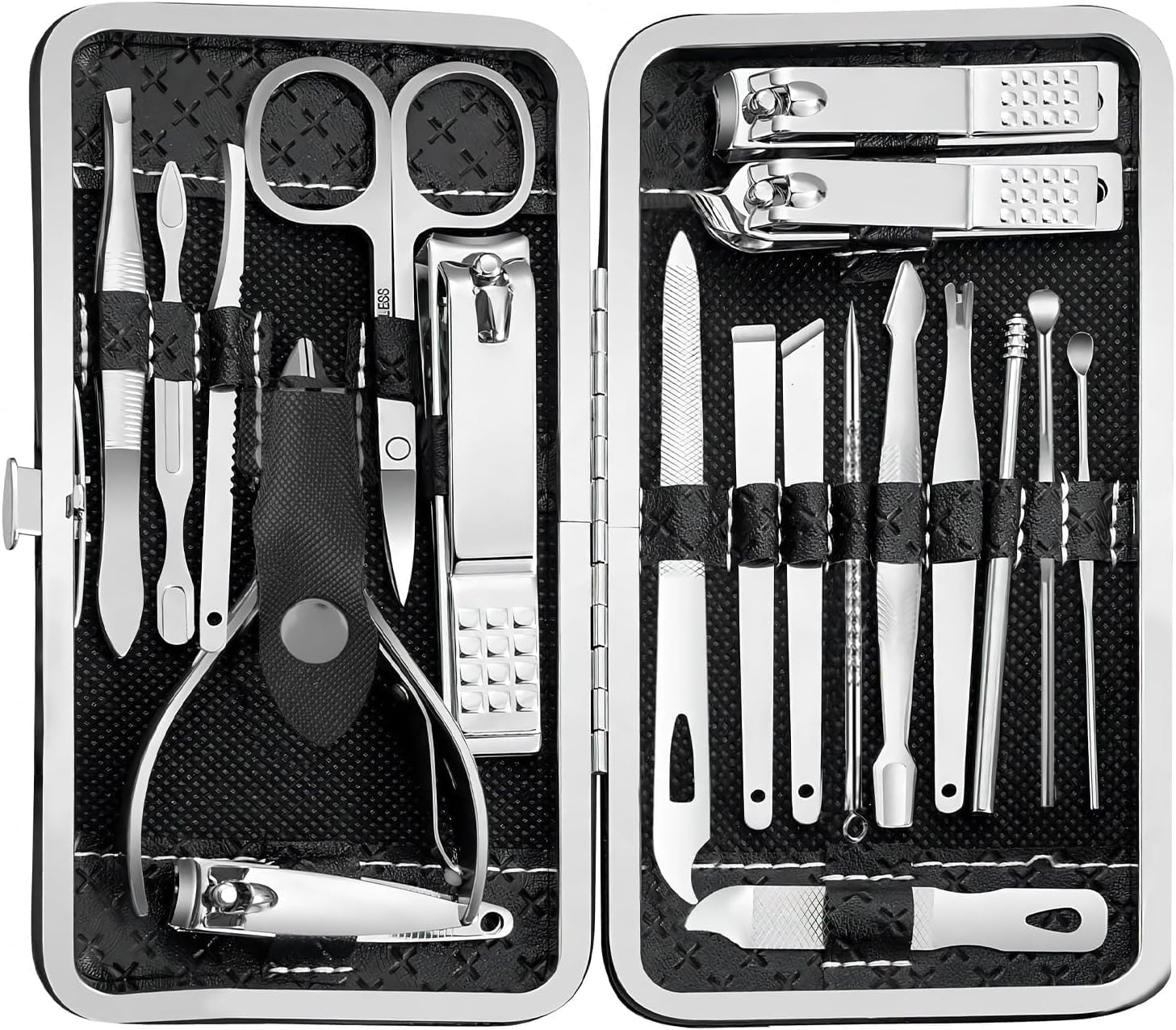 COMPLETE SET: 19-piece professional manicure and pedicure kit includes nail clippers, scissors, and grooming tools in a compact travel case