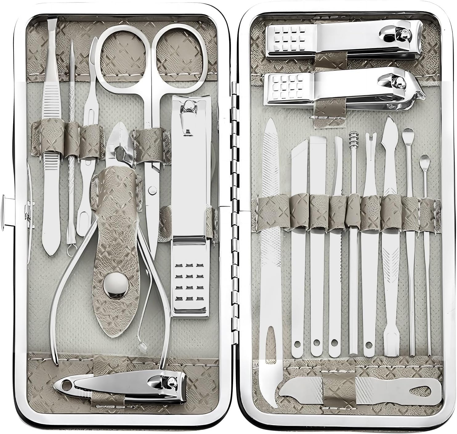COMPLETE SET: 19-piece professional manicure and pedicure kit includes nail clippers, scissors, and grooming tools in a compact travel case
