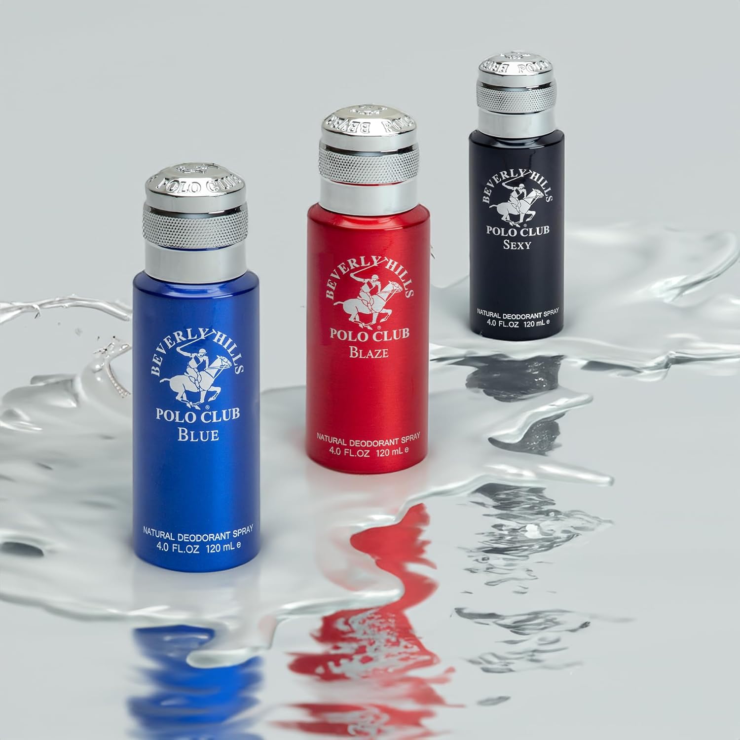 THE PERFECT TRIO - Elevate your daily self-care routine with the Beverly Hills Polo Club Natural Body Spray for Men Collection offering masculine scents for every mood and occasion. Crafted to rival the classics, our three men's fragrances signature scents: Blaze, Blue, and Sexy are just what you need to leave indelible impression.