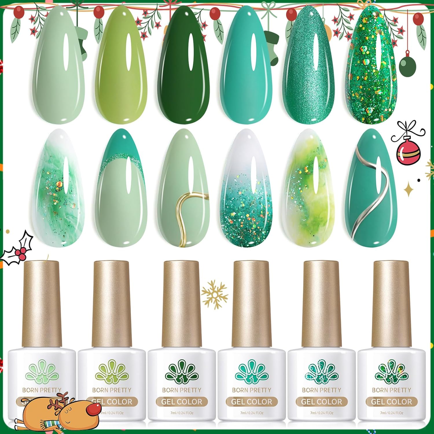 Born Pretty Green Gel Nail Polish, Christmas Carnival Evergreen Gel Nail Polish Set, Glitter Green Sparkle Gel Polish Nail Art Varnish Manicure Collection St. Patrick's Day 6PCS