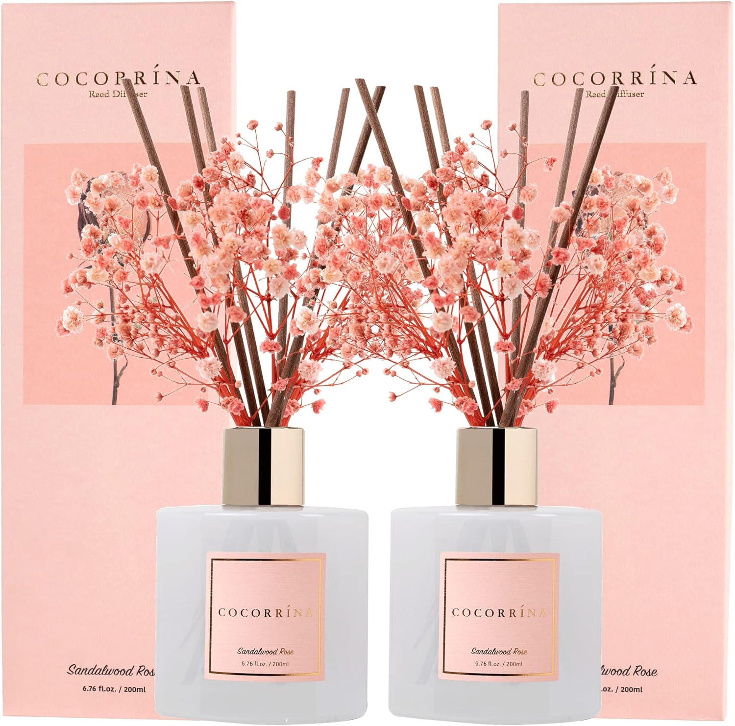 Cocorrína Premium Reed Diffuser Set with Preserved Baby's Breath & Cotton Stick Sandalwood Rose 2 Packs, 6.7oz Scent Fragrance Oil Diffuser for Bedroom Bathroom Home Décor