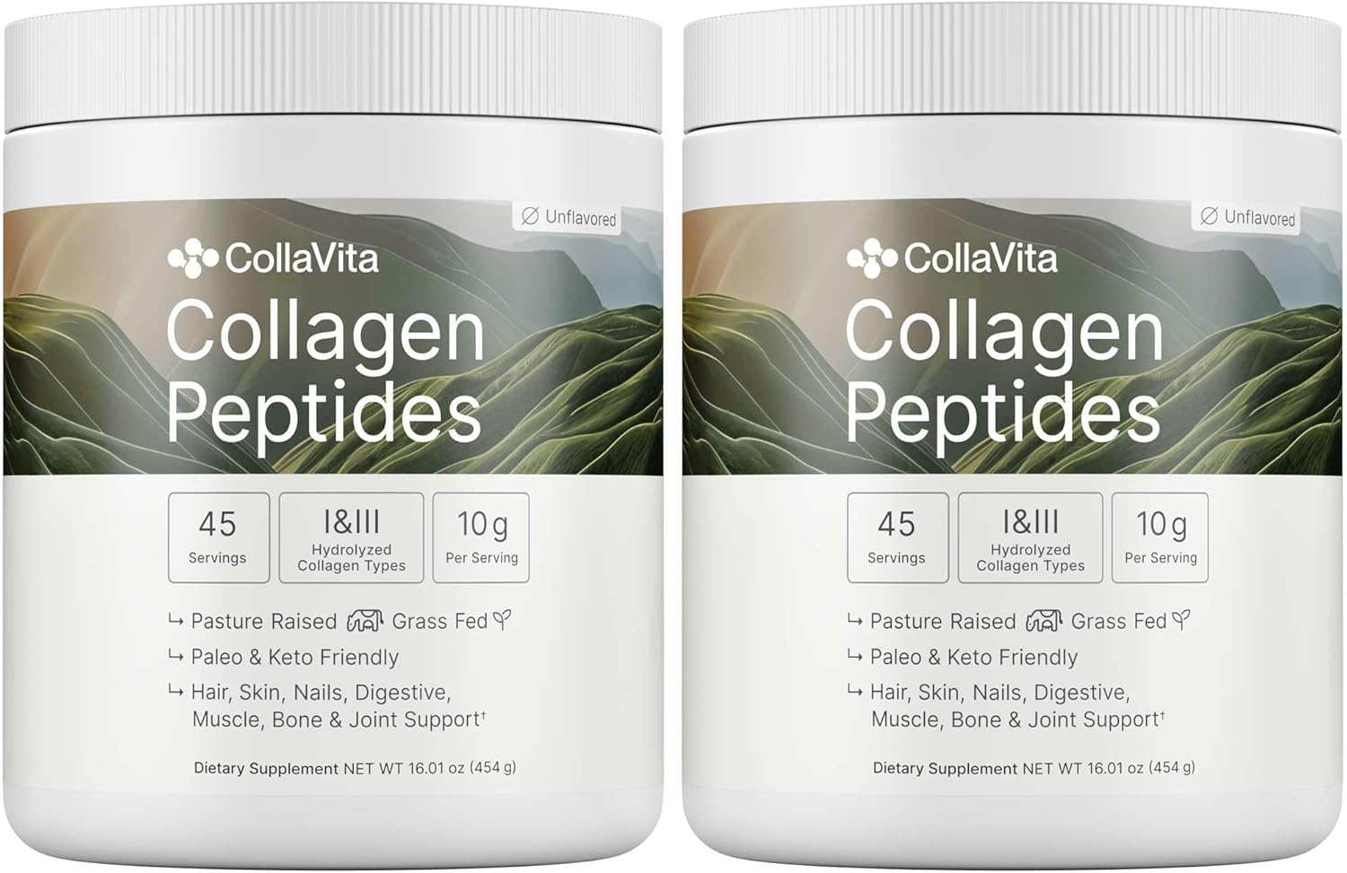Collagen Peptides Powder Grass-Fed Pasture-Raised Hydrolyzed Collagen Powder, Type I & III Hair, Nails, Skin and Joints, Non-GMO, Paleo & Keto, Unflavored, 16 Fl oz. 2 Pack, 45 Servings