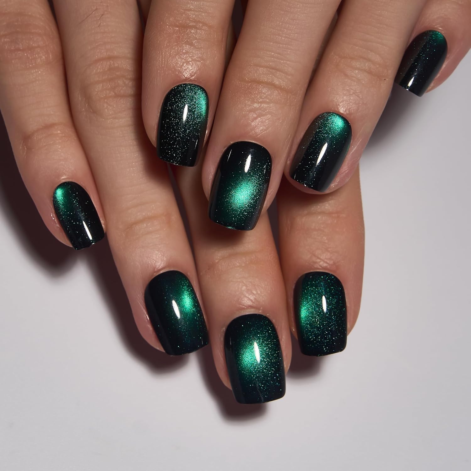 Curvlifie 3 Angle Cat Eye Press on Nails - Color Changing Short Square Fake Acrylic Nails with 3 Angle Shift Effects, Full Cover False Nails Tips Glossy Reusable Manicure Set for Women