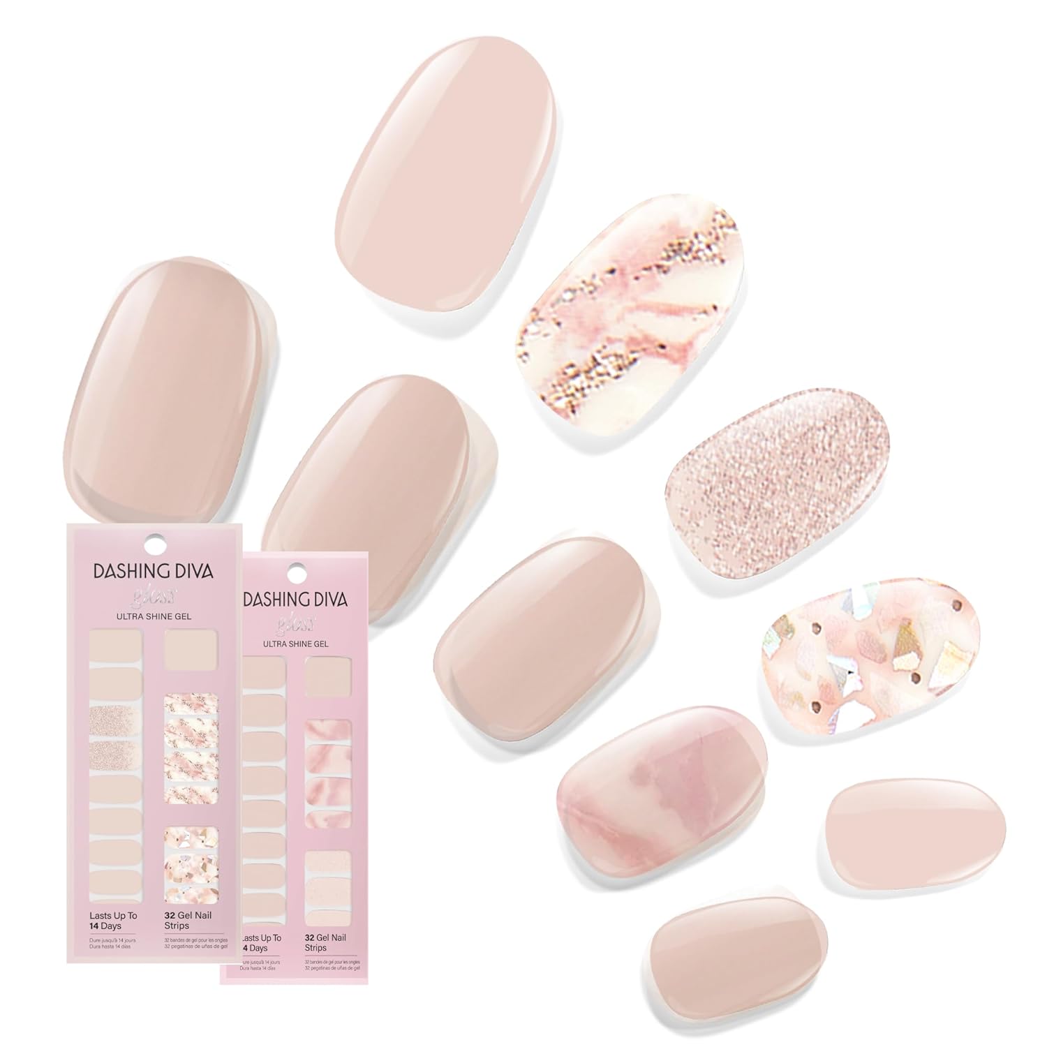 Includes: 2 x Gel Strip Sets. Each set includes 32 gel manicure strips (20 base color, 12 accent), 1 prep pad, 1 nail file. Easily remove nail strips with nail oil or acetone
