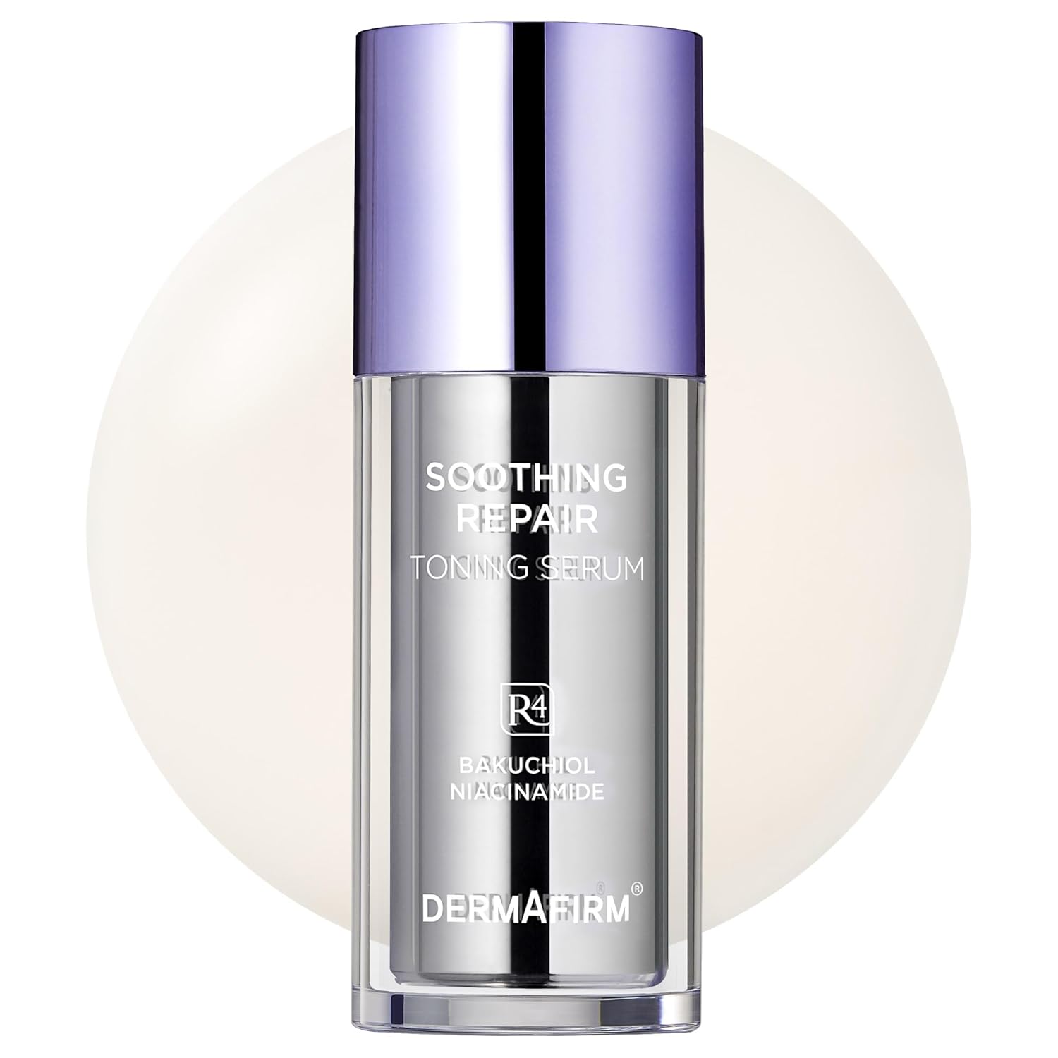 NATURAL SKIN TRANSFORMATION: DERMAFIRM Soothing Repair Facial Serum R4, Korean Face Serum combines the power of bakuchiol (a natural retinol alternative) and niacinamide to target skin concerns like dark spots and uneven tone. Experience visibly improved skin with these gentle yet effective ingredients. It uses the potency of natural botanicals such as Eucalyptus, Collagen, Peptides and Perilla leaf, offering a holistic solution to skin imperfections like freckles and age spots and wrinkles.