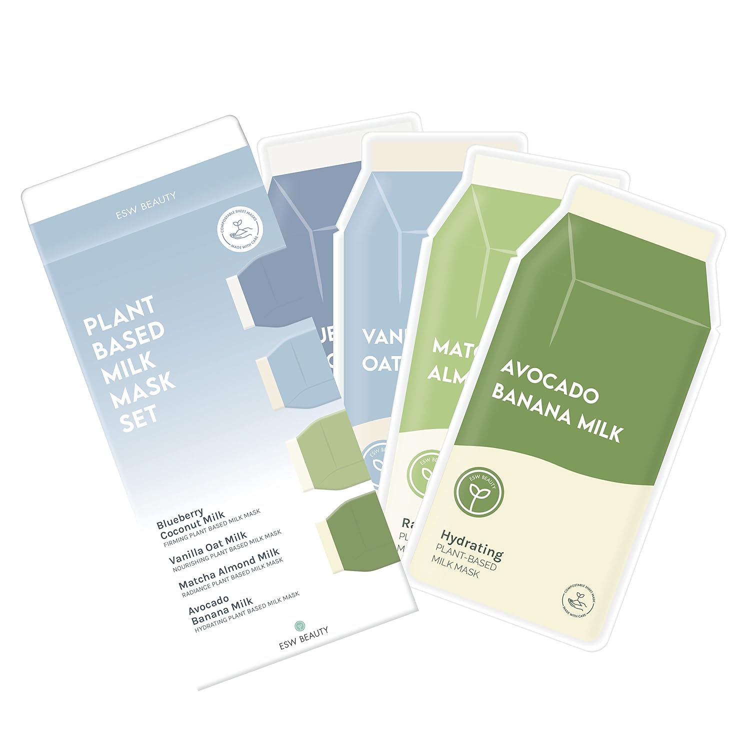 ESW Beauty Plant-Based Milk Face Masks - 8-Pack Skincare Set - Hydrating, Radiance, Firming & Soothing with Avocado, Matcha, Blueberry, Vanilla & Oat Extracts for All Skin Types