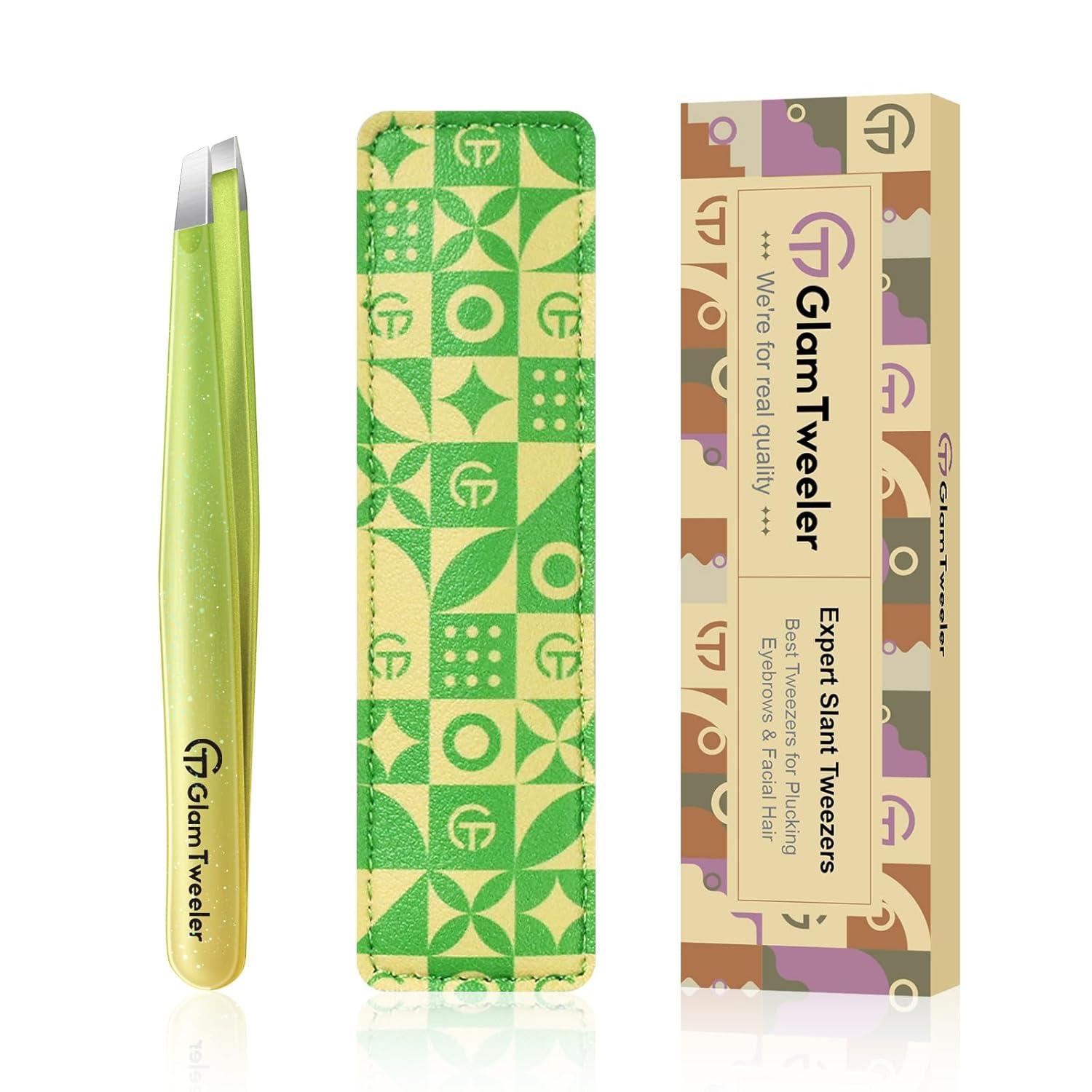 Expert Eyebrow Hair Removal Tweezer with Leather Case, GlamTweeler High Precision Slant Tip Stainless Steel Tweezers for Men and Women (Sparkle Apple Green & Yellow)