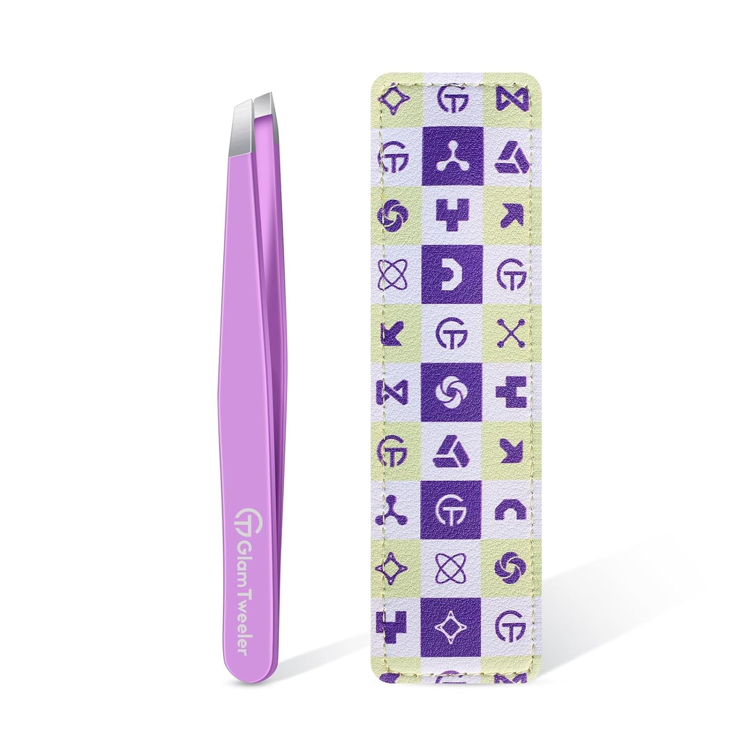 Expert Slant Tip Tweezers with Leather Case, GlamTweeler Sharp & Precision Stainless Steel Tweezer for Eyebrows, Facial Hair and Fine Hairs Removal (Violet)