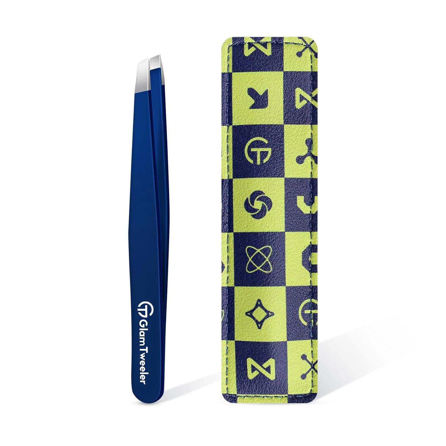 Expert Slant Tip Tweezers with Leather Travel Case, GlamTweeler Sharp & Precision Stainless Steel Tweezer for Eyebrows, Facial Hair and Fine Hairs Removal (Navy Blue)