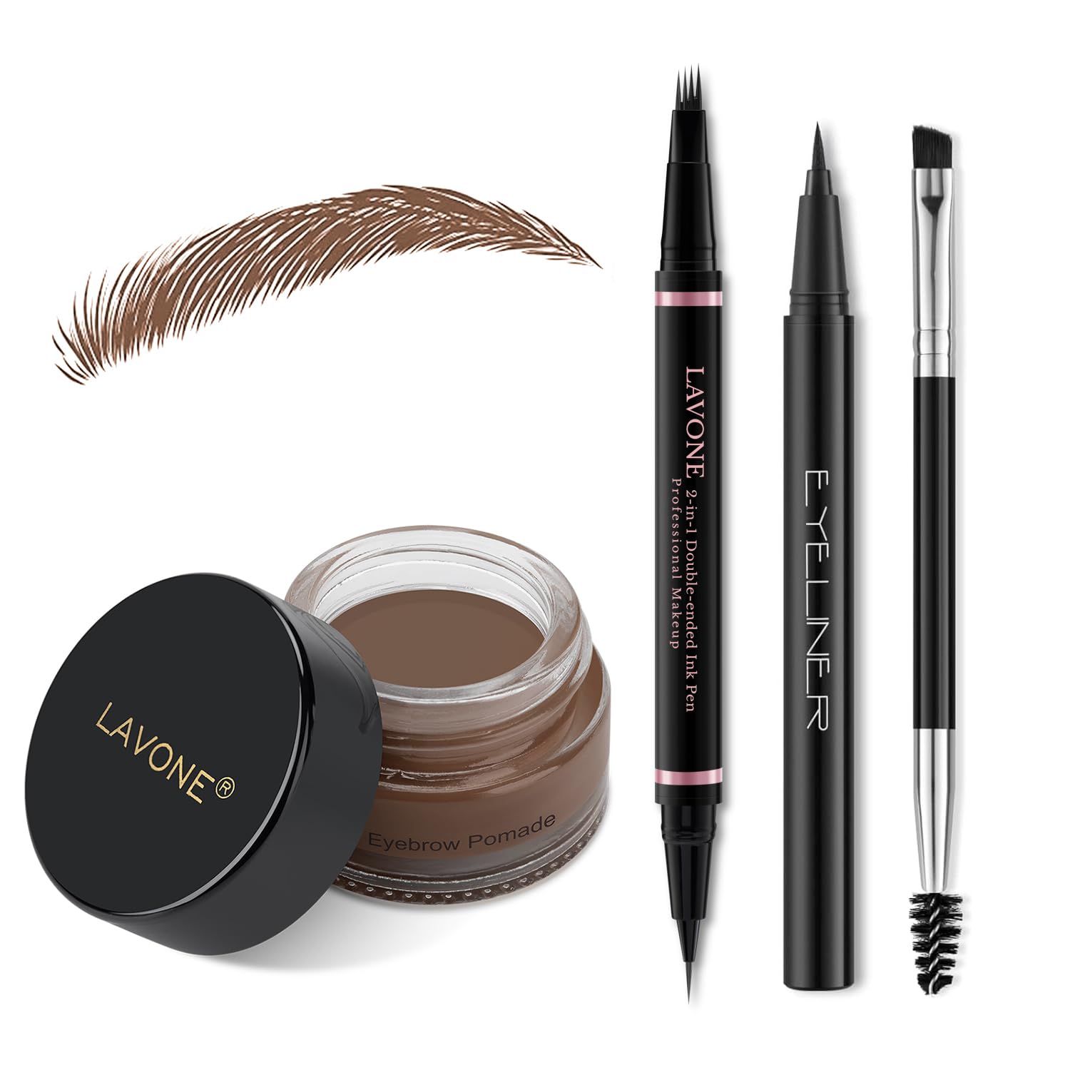 【What You Can Get】: LAVONE brow pen make up eyebrow kit includes brow pencil (color: brunette), brow pomade (color: brunette), eyeliner (color: black) and dual-ended eyebrow brush. The microblading brow pencil kit with a zipper pouch for on the go.