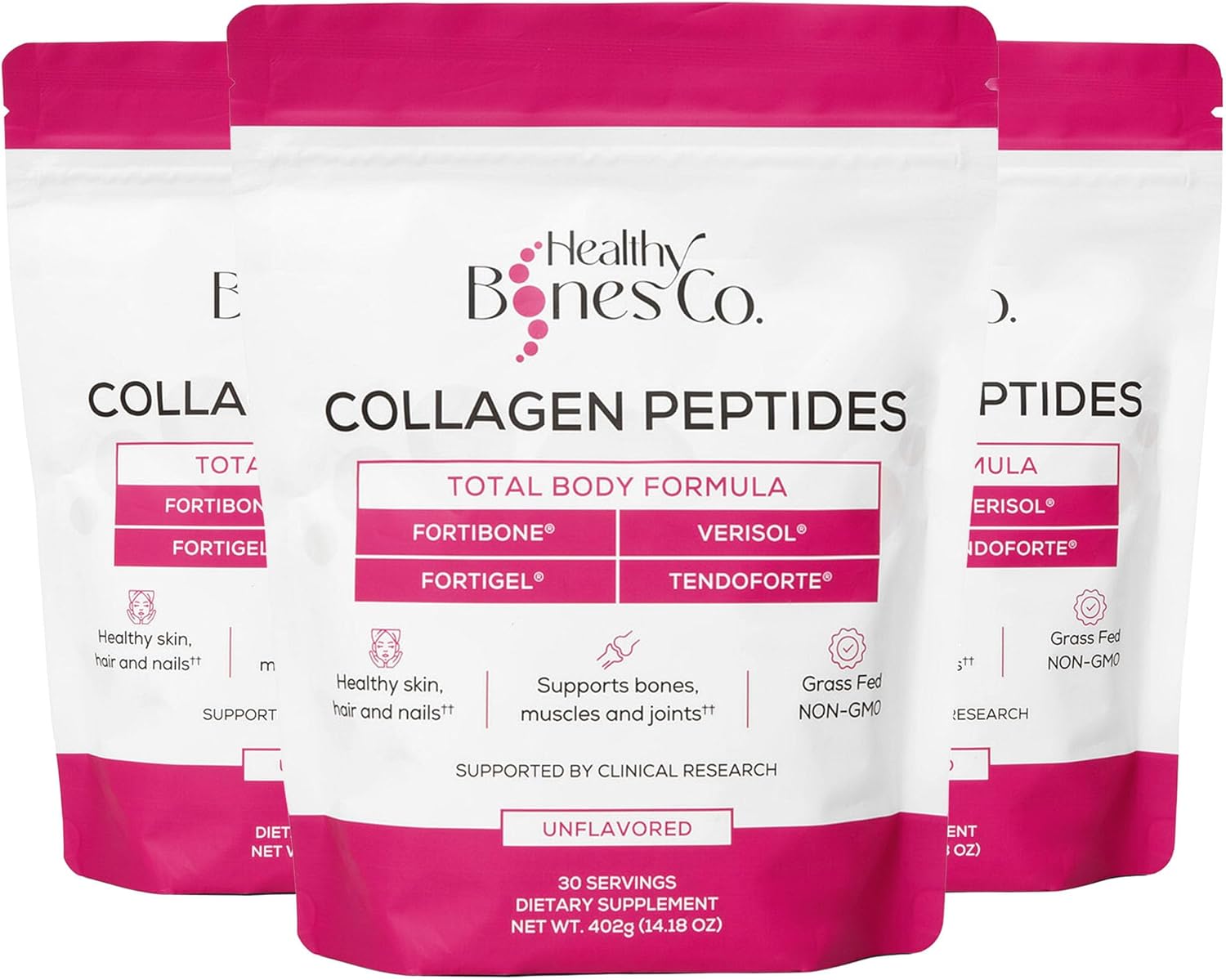 Not your average collagen: A unique blend of four patented Bioactive Collagen Peptides FORTIBONE, FORTIGEL, VERISOL and TENDOFORTE with clinically proven benefits for bones, joints, skin, hair, and nails.