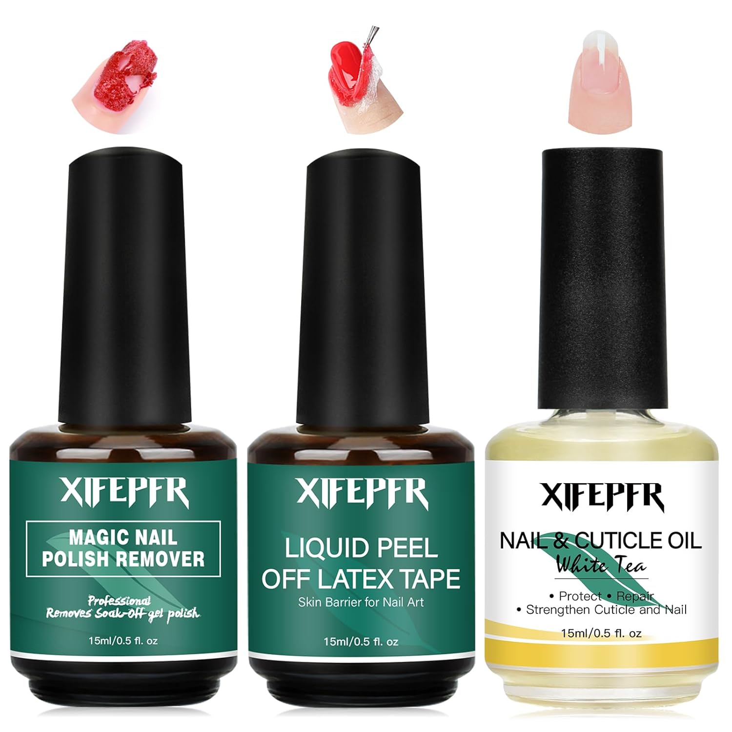 Gel Polish Remover Kit: Our kit includes 1pcs gel nail polish remover, 1pcs liquid latex for nails and 1pcs cuticle oil. 3-in-1 gel remover kit helps you quickly remove gel nail polish without damage nails, cuticle oil nourish and repair your nail cuticles, leaving your nails ready for the next manicure. Quick & easy gel polish remover set.