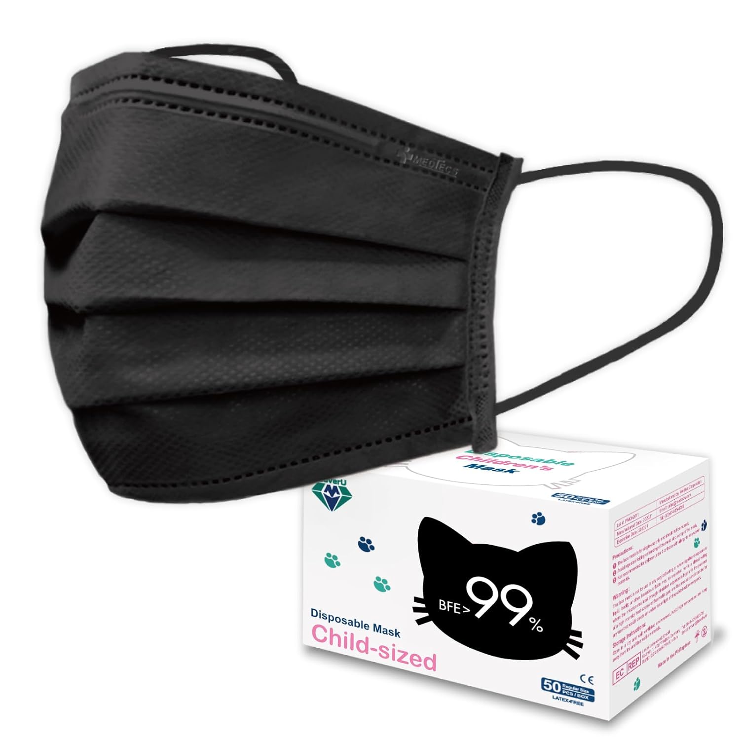 Medtecs Kids Face Mask Disposable - 2 Sizes Option (Child/Youth) 50 PCs - Comfy 3-Ply Breathable Children Masks, The Better Choice - Child | Black