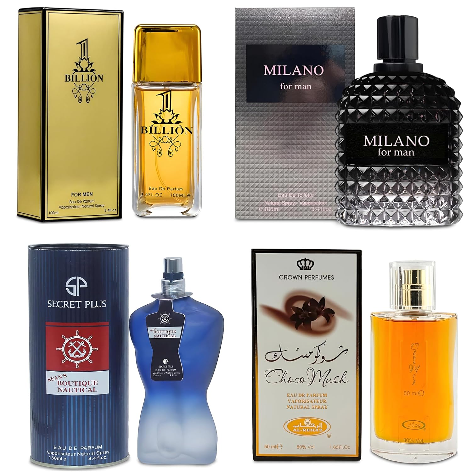 Men Cologne 4-Piece Combo Set (Choco/Milano/Billion/Sean's Boutique Nautical) Each 100ml Eau de Toilette/Parfume Spray Premium Men Perfume Set Long Lasting Fragrance for Daily Use