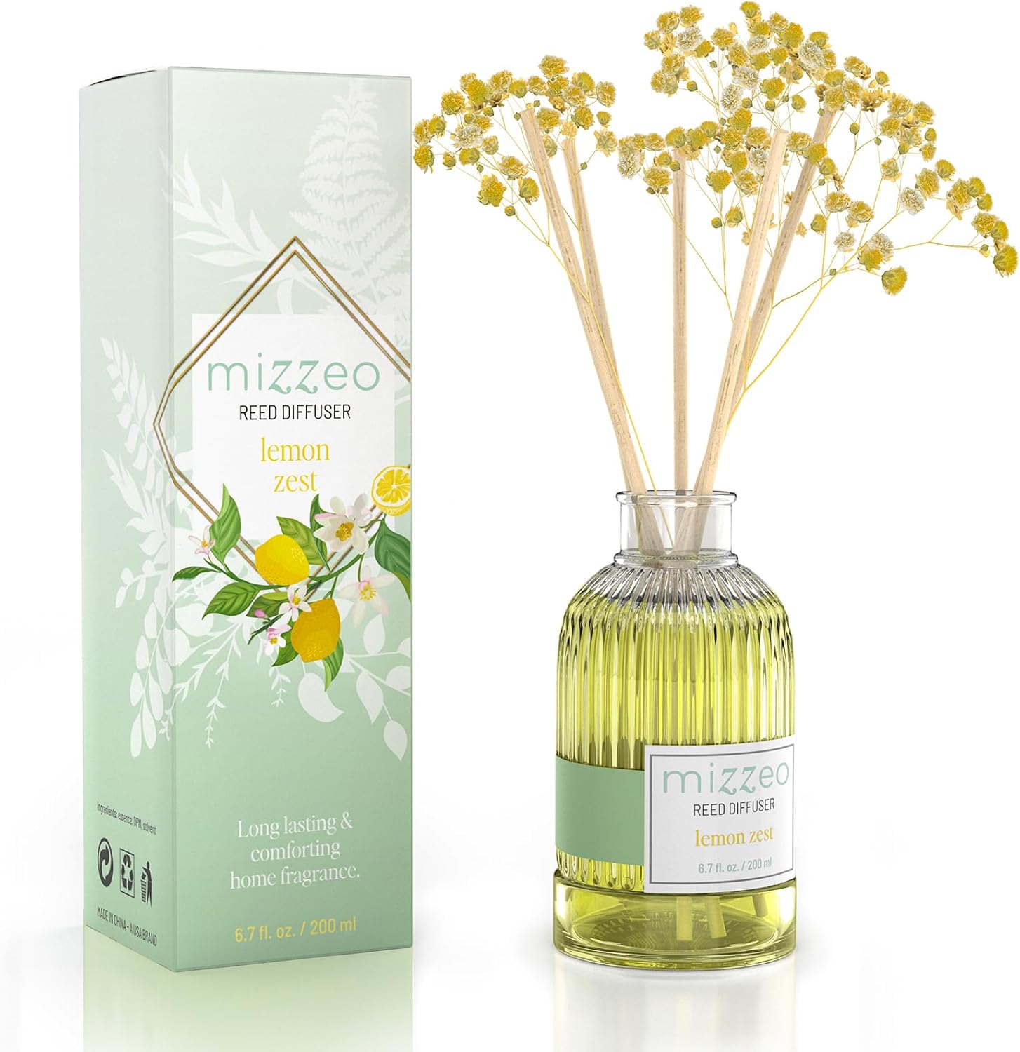 MIZZEO Reed Diffuser Set, Lemon Zest 6.76 fl oz Highly Scented Room Diffuser Home Fragrance Essential Oil Reed Flower Diffuser, House Bedroom Office Decor & Gifts
