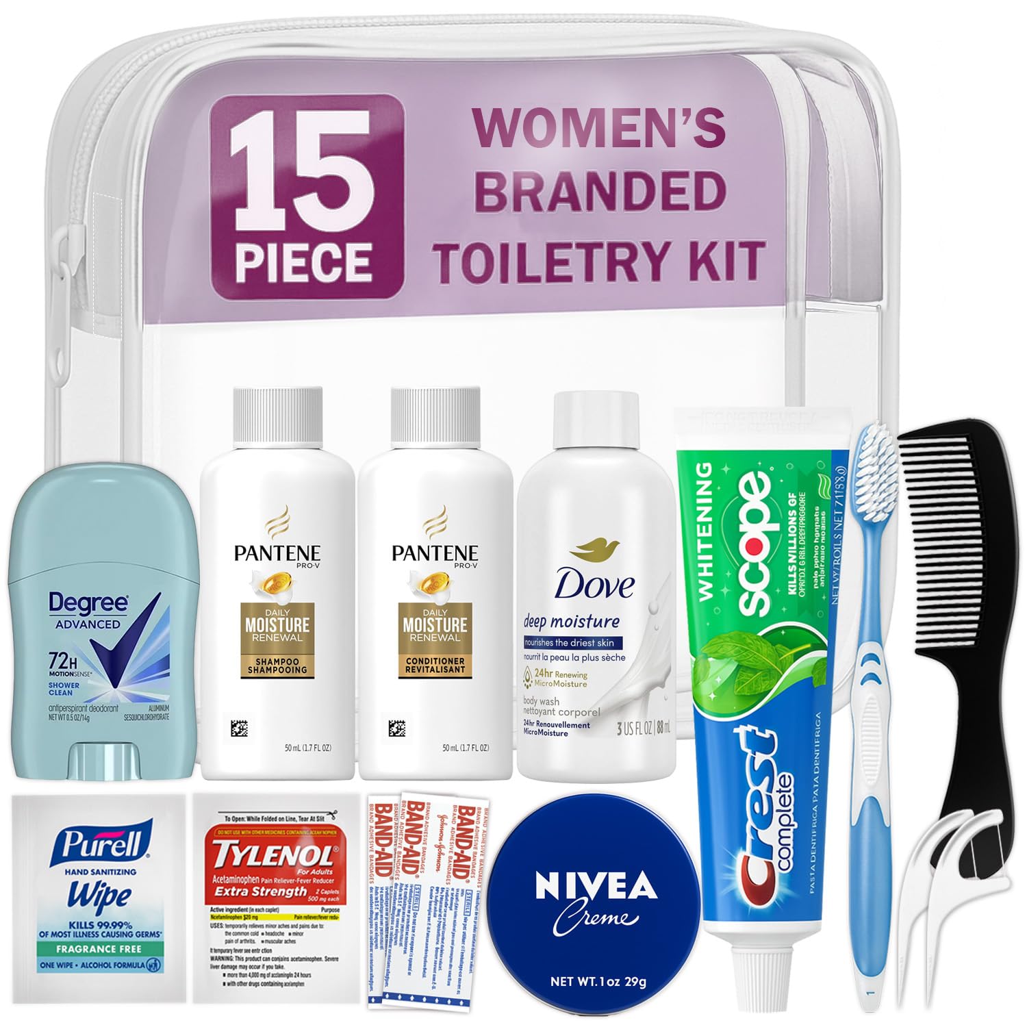 MADE FOR WOMEN – This complete 15-piece hygiene kit features trusted, travel-size products tailored to women's needs, including Degree Women antiperspirant, Dove body wash, Pantene Moisture shampoo and conditioner, lotion, toothpaste with toothbrush, floss picks, cleansing wipe, a comb, Tylenol and band-aids—everything you need to stay fresh and prepared on the go.