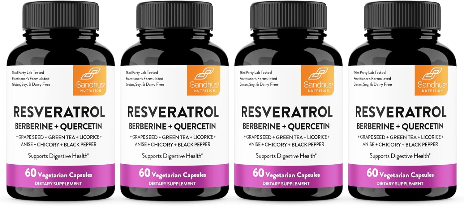 Sandhu's Resveratrol with Berberine for Gut Health | Digestive Supplement for Women & Men | Green Tea, Star Anise, DGL, Grape Seed Extract & Quercetin | Eases Bloating | 60 Capsules (Pack of 4)