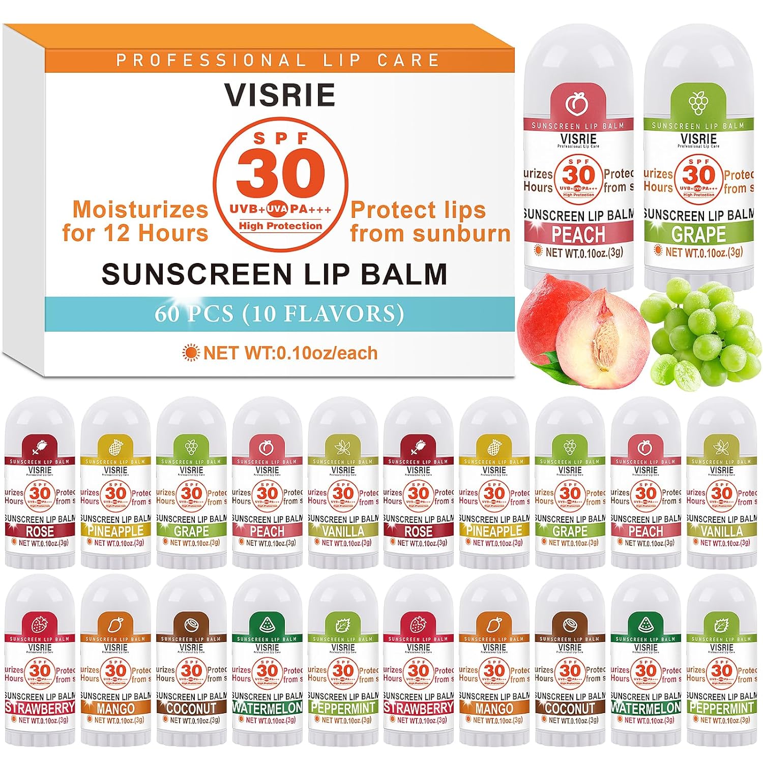 SPF 30 Sunscreen Lip Balm, SPF Lip Balm Bulk 60 Count, Broad Spectrum UVA/UVB Lip Sunscreen with Vitamin E and Coconut Oil- 10 Flavors