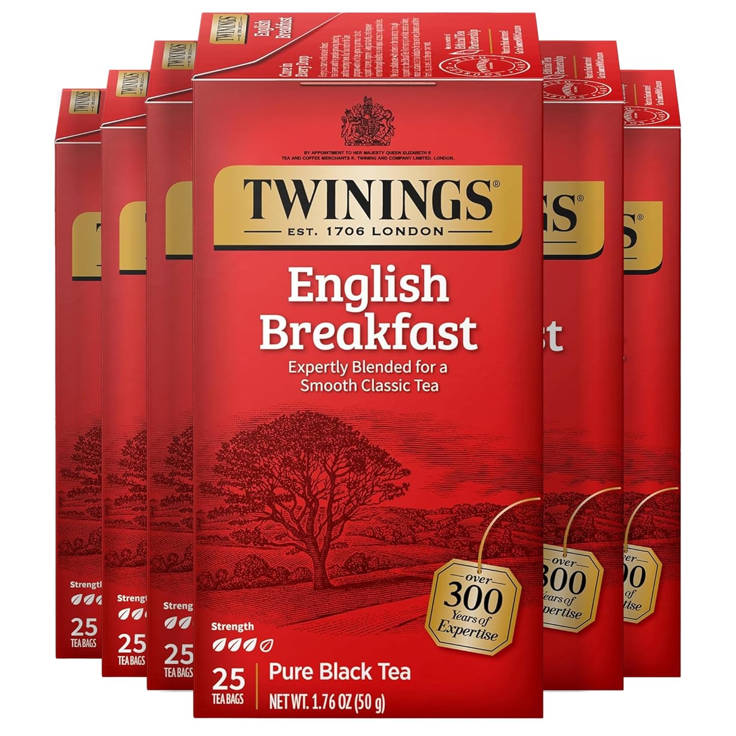 TWININGS MOST POPULAR TEA: English Breakfast, created by selecting some of the finest teas, each with their own unique characteristics for a well-balanced blend; Caffeinated, 25 Count, Pack of 6