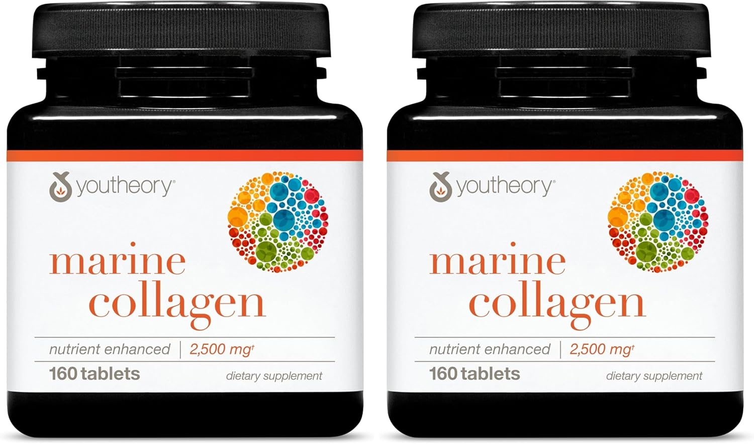 Youtheory Marine Collagen - 2,500 mg Hydrolyzed Collagen - Supports Skin* - Fish-Sourced Supplement with Vitamin C, A, E, B6, B12 & More - Highly Digestible & Absorbable - 160 Tablets (Pack of 2)
